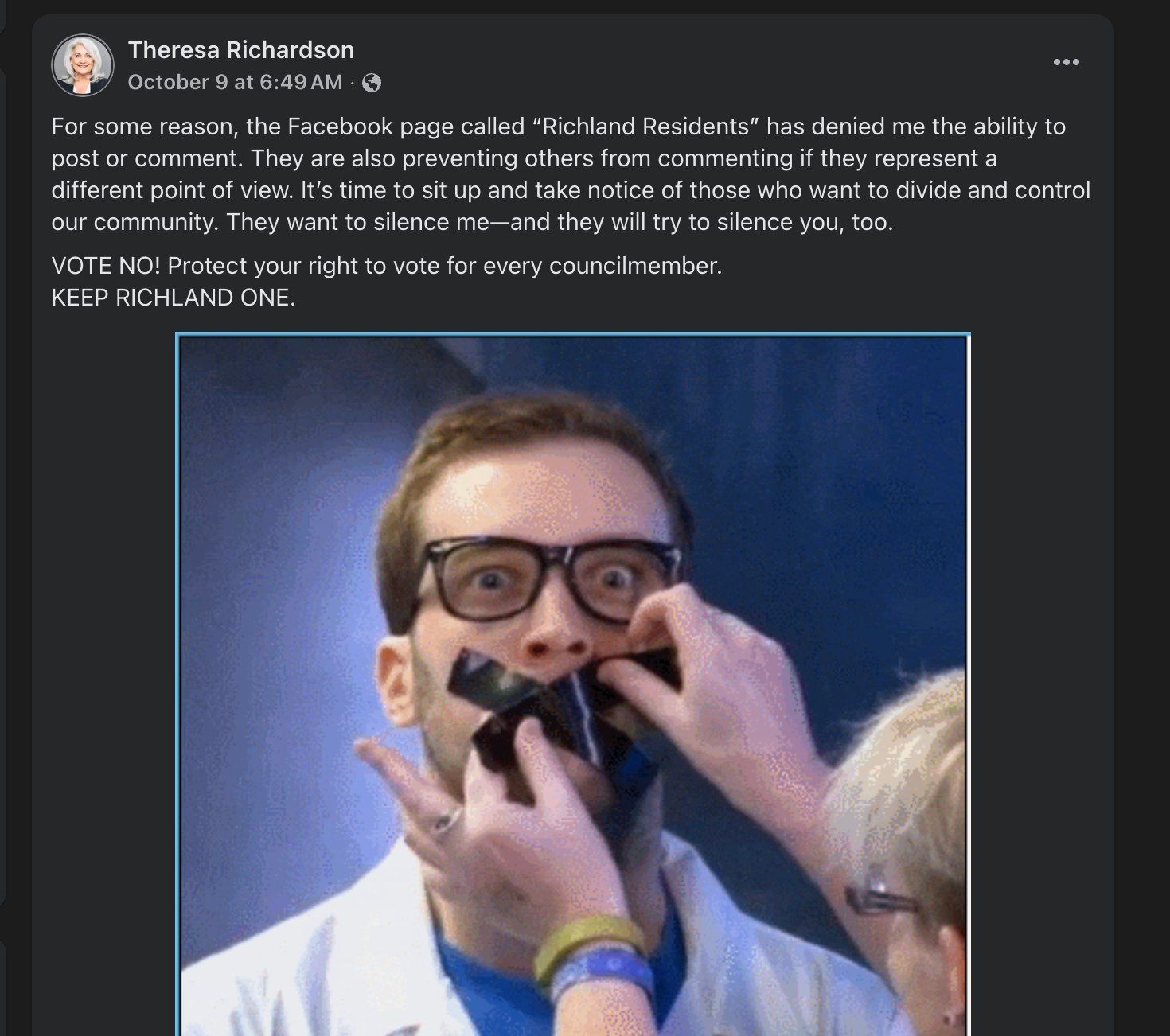 A few days ago Richland Mayor Theresa Richardson shared a meme claiming victimhood of being ‘censored’, which she persisted in, regardless of facts presented, because (as became clear) her only goal was Aura Farming.